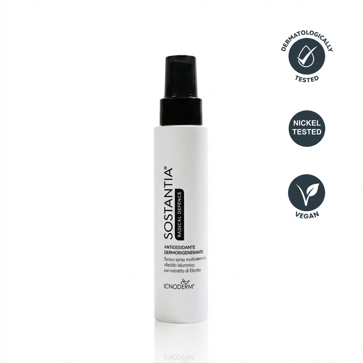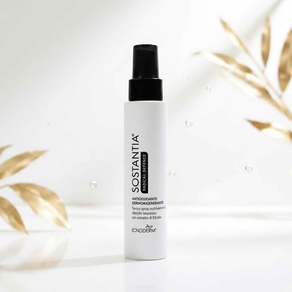 SOSTANTIA RADICAL DEFENSE is a highly innovative multivitamin spray toner, designed to effectively combat the oxidative stress that damages the skin on a daily basis. Its advanced formula, enriched with hyaluronic acid, helichrysum extract, and vitamin C, offers a skin-regenerating and smoothing action, visibly improving skin quality.